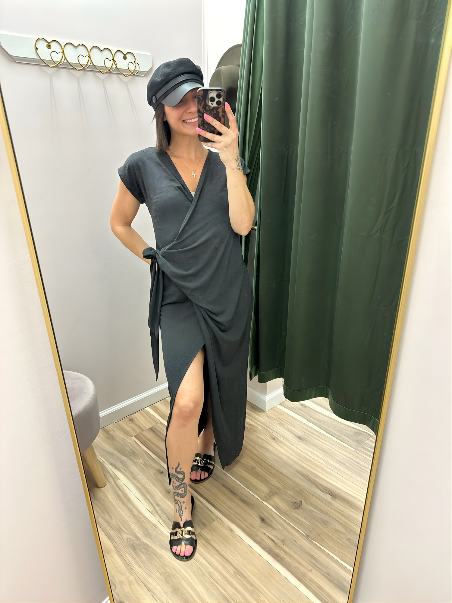 Designed with a surplice (wrap-style) neckline and an adjustable side tie, this dress creates a naturally flattering silhouette that defines the waist while still feeling comfortable. The soft, draped fabric flows beautifully, and the side slit adds just the right amount of movement and edge.