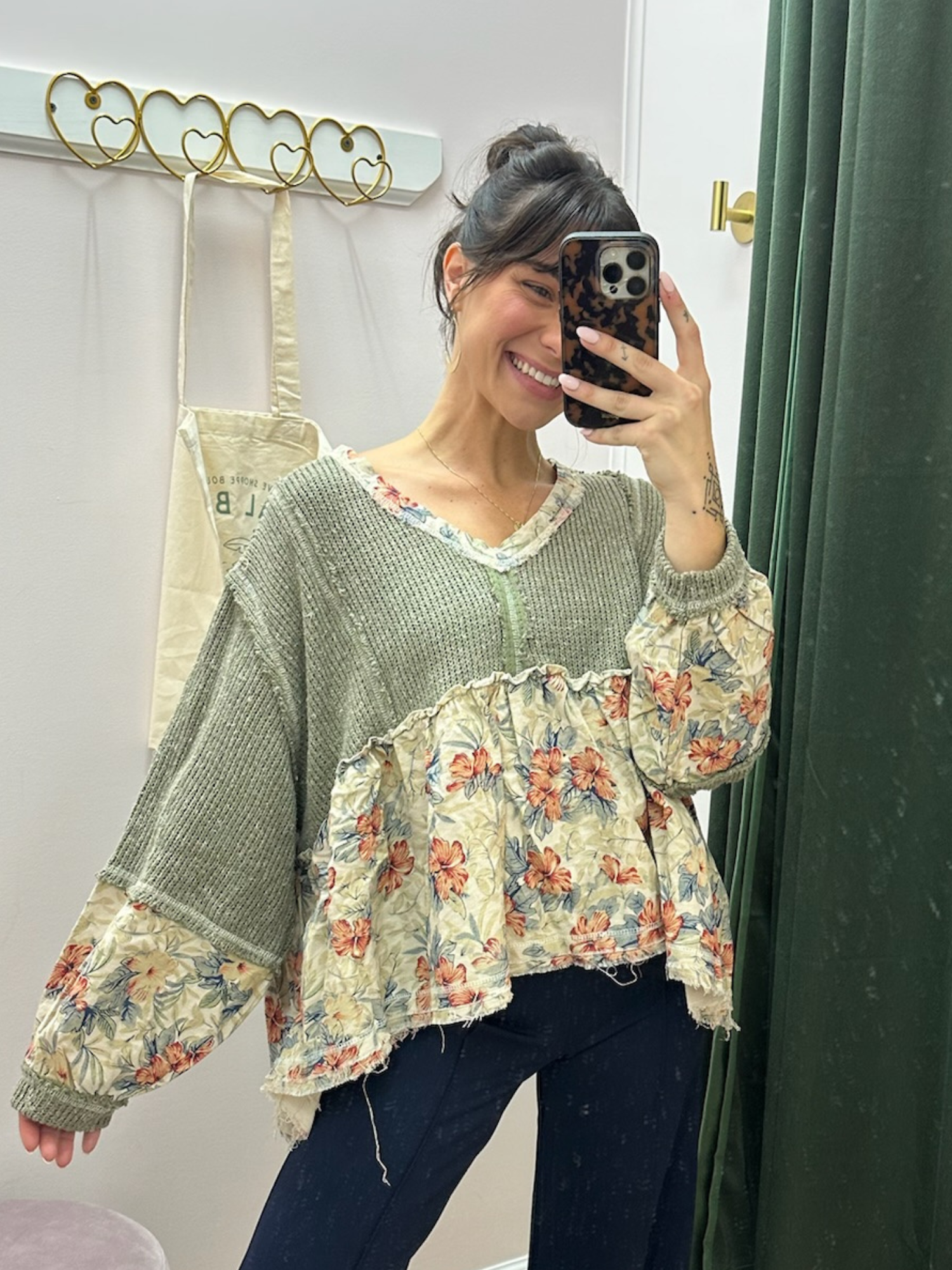 This is that throw it on and feel instantly put together top 🌿✨ The mix of soft waffle knit and floral woven fabric gives it that effortless boho feel while still looking styled and unique.