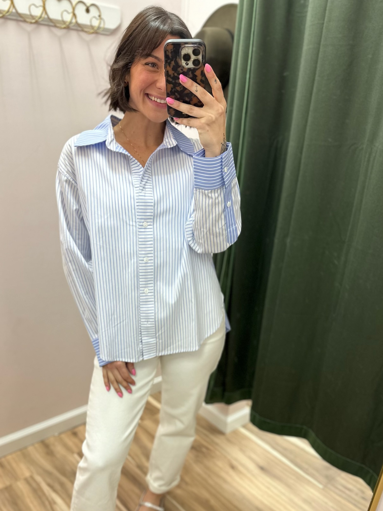 A timeless piece with a fresh, modern feel. This striped collared top features a relaxed fit with classic button-front styling and crisp blue and white stripes that never go out of style. Lightweight and breathable, it's perfect for layering or wearing on its own for an effortlessly polished look.