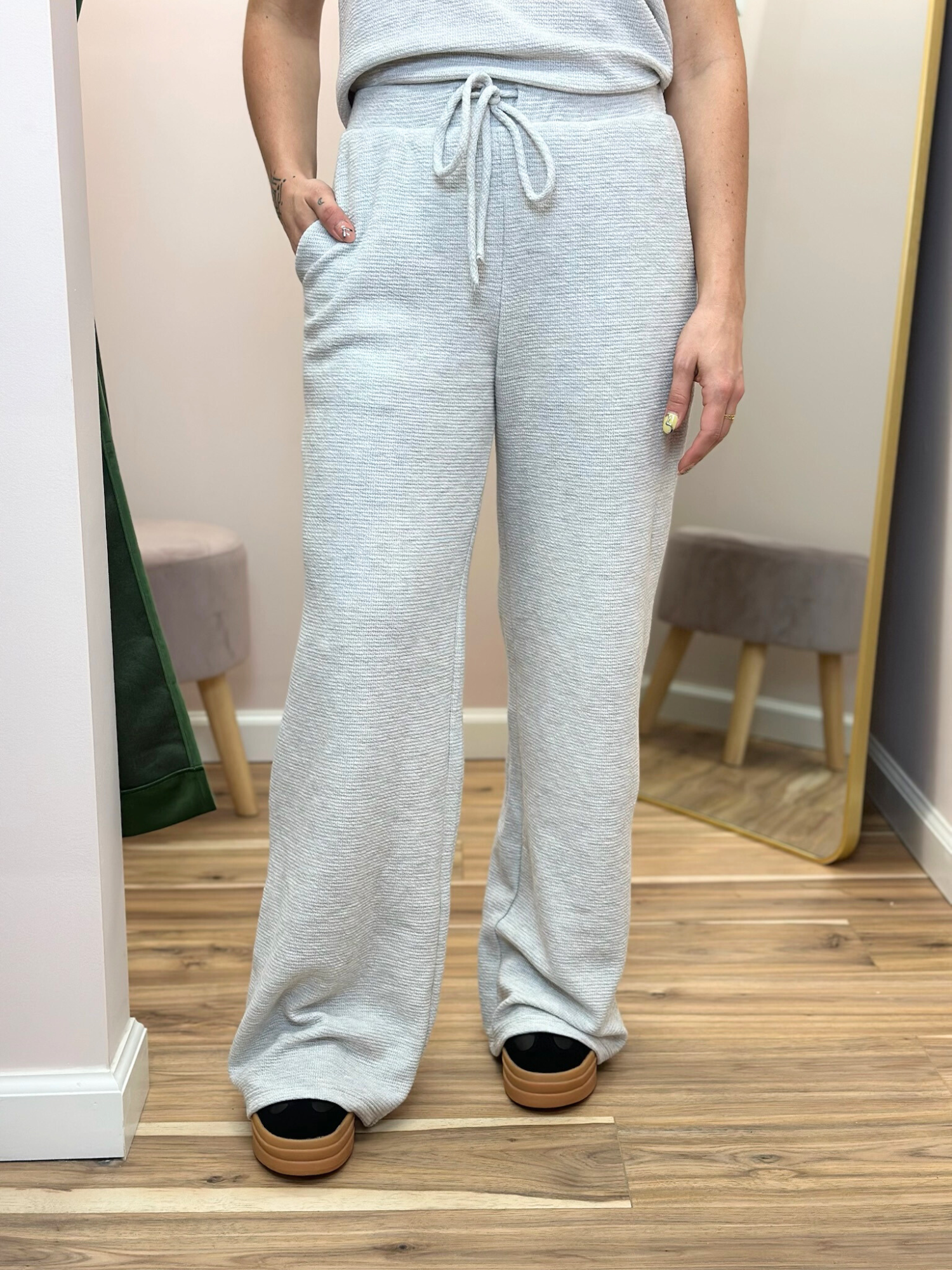 Designed with a flattering elastic waistband and adjustable drawstring, these pants sit comfortably at the waist while the wide leg drape creates a polished, elevated look. The lightweight textured fabric adds subtle dimension while still feeling breathable and incredibly soft.