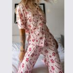 The playful design showcases delightful candy canes scattered across the pink background, adding a touch of festive charm to your holiday wardrobe. Whether you’re unwinding at home with a cup of cocoa or hosting a cozy movie night with friends, this loungewear set is sure to be a hit.