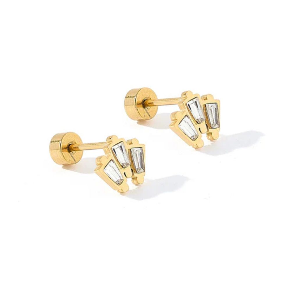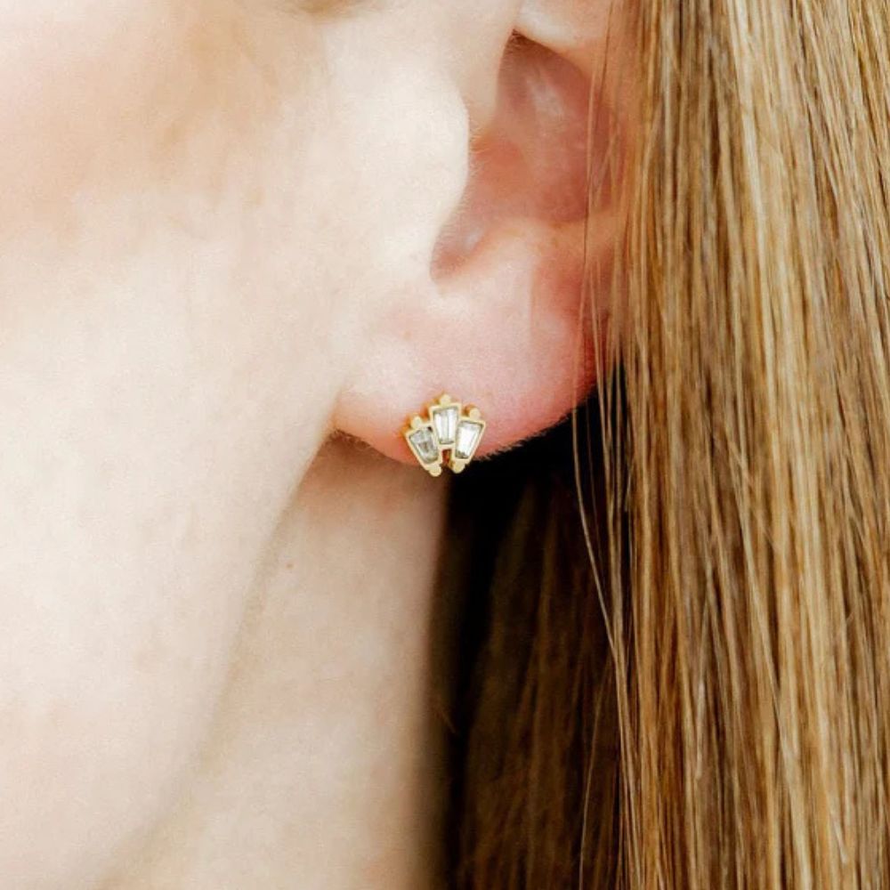 Gold geometric stud earrings with baguette-style stones for a sleek, modern touch.