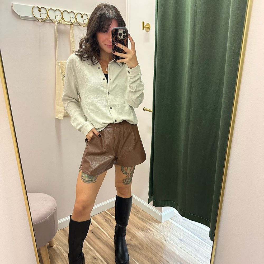 Add a little edge to your fall wardrobe with these metallic faux leather high-waist shorts. The rich brown finish gives a chic, modern touch while the structured fit keeps them flattering and wearable. Dress them up with a sleek bodysuit and boots or keep it cozy with an oversized sweater. Soft on the inside, bold on the outside, and perfect for nights out, holiday events, or elevating your everyday style.