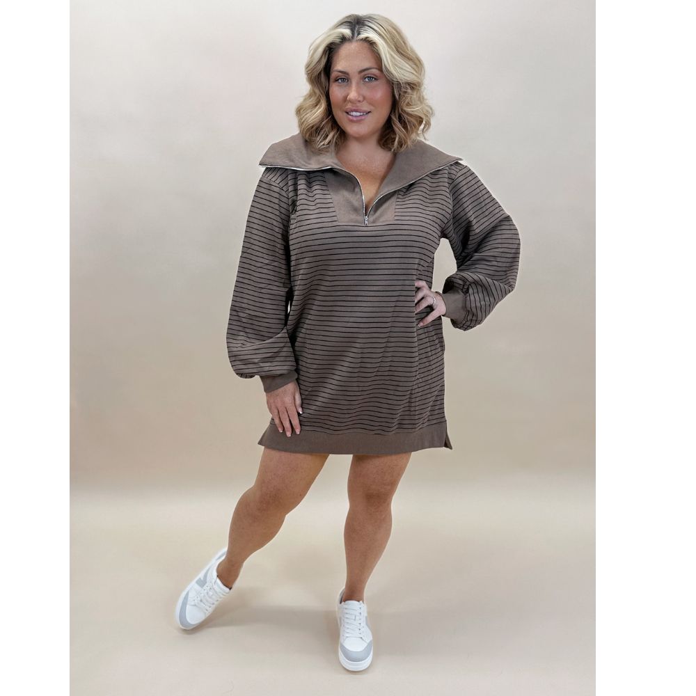 Stay comfy and chic in this striped sweatshirt dress featuring a wide zip-up collar, soft long sleeves, and a relaxed fit. Perfect for everyday wear or weekend outings.