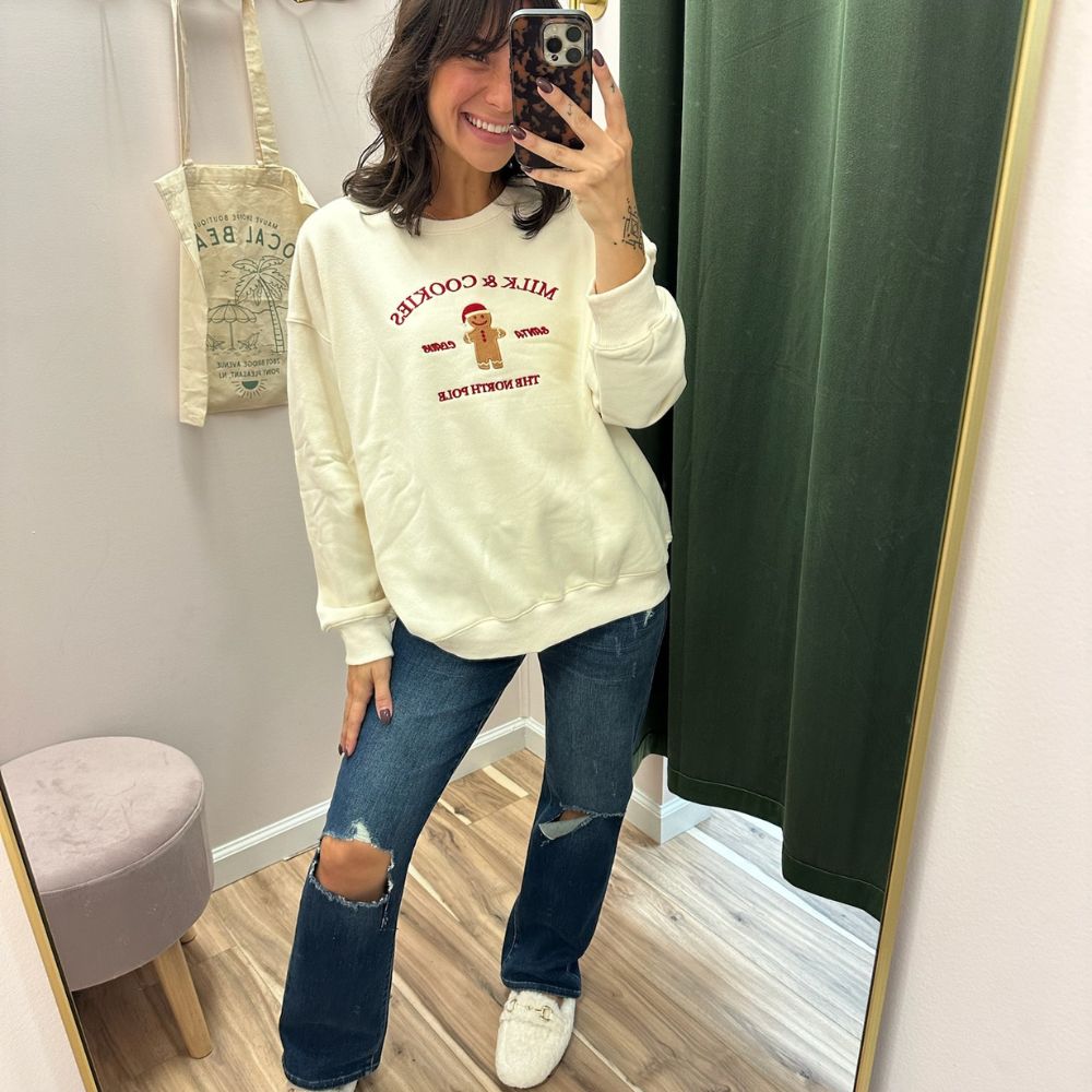 Get ready to cozy up in our Milk & Cookies Holiday Crewneck — the perfect blend of festive cheer and everyday comfort. This soft ivory sweatshirt features a playful gingerbread graphic with retro-inspired lettering that reads “Milk & Cookies, The North Pole Baking Co.” Whether you’re sipping cocoa, decorating cookies, or enjoying a casual day out, this relaxed-fit crewneck pairs effortlessly with your favorite jeans or leggings. Designed with a soft fleece interior and classic ribbed trim, it’s the ultimate holiday sweatshirt for lounging or layering.