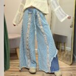 Crafted from soft, lightweight striped denim, they offer a perfect balance of structure and flow — ideal for all-day wear. The standout feature is the floral trim running down the center of each leg, adding a touch of vintage-inspired femininity and playful contrast. A decorative mini pocket detail completes the look, giving these pants that unmistakable POL twist of creativity and charm.